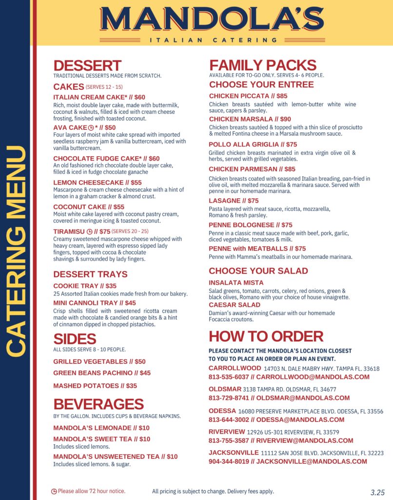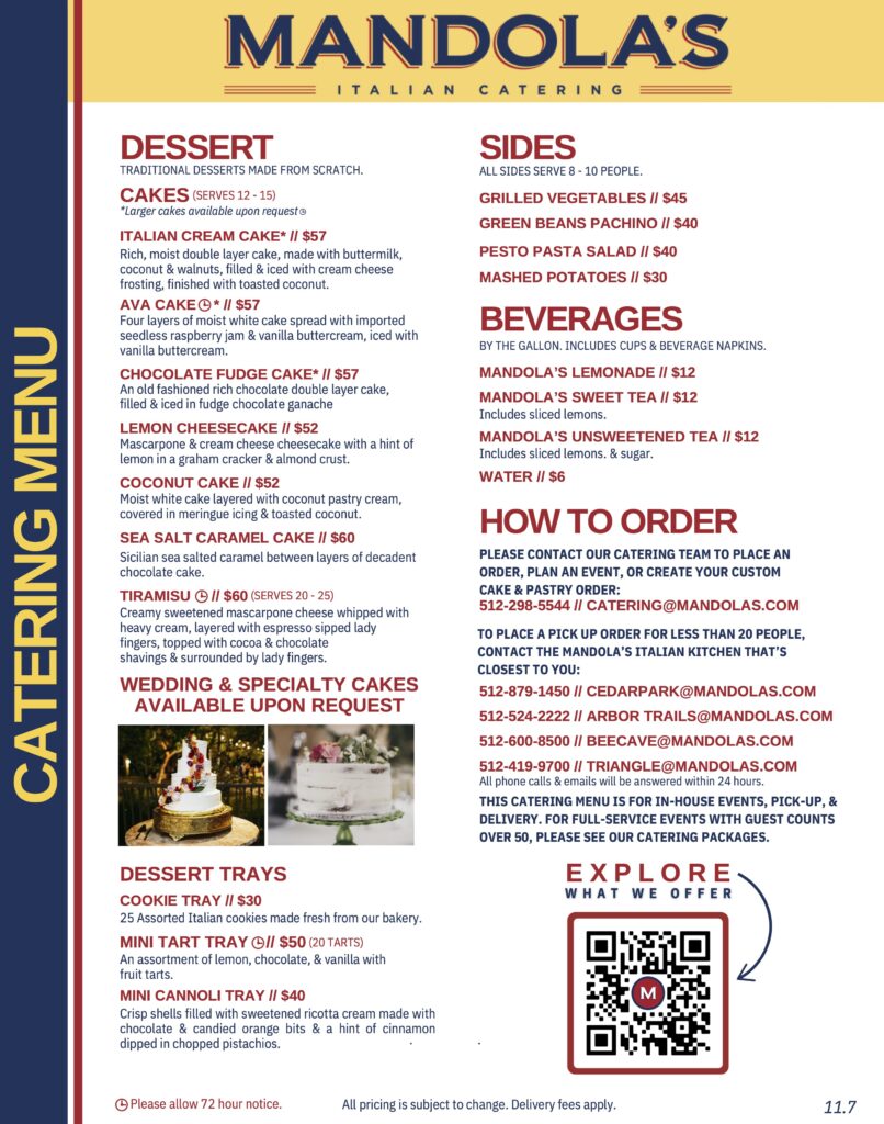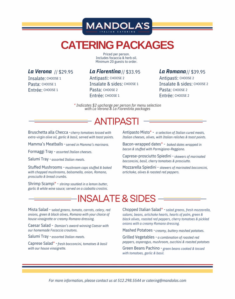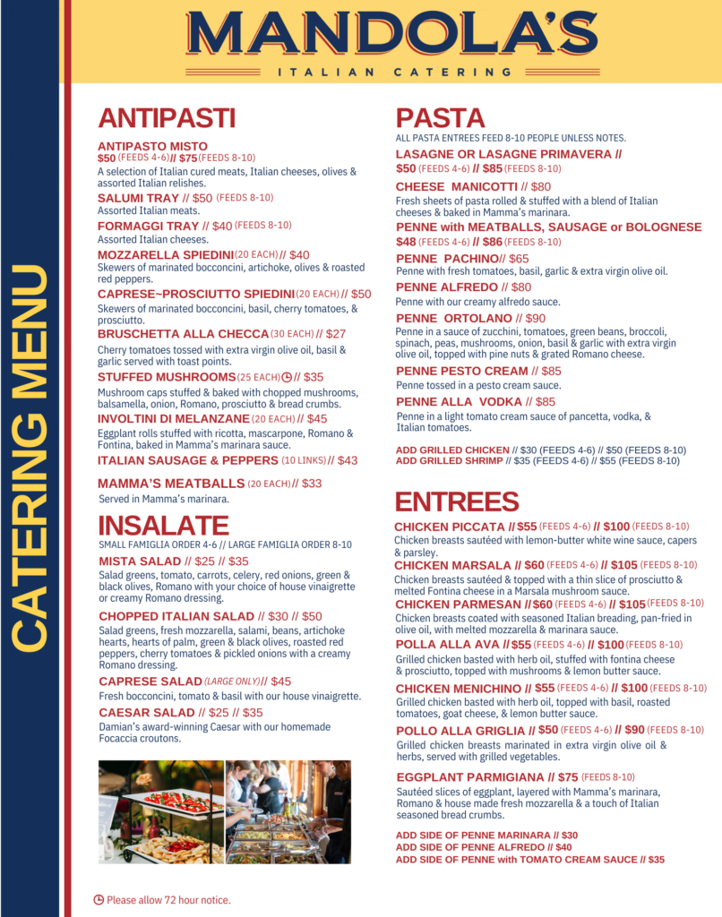 At Mandola’s Events, we are more than just a catering service. Our menus are inspired by cherished family recipes and crafted with the finest ingredients, delivering authentic Italian flavors that elevate any celebration. From savory pastas and fresh salads to handcrafted desserts and classic antipasti, each dish is prepared to perfection by our experienced culinary team.