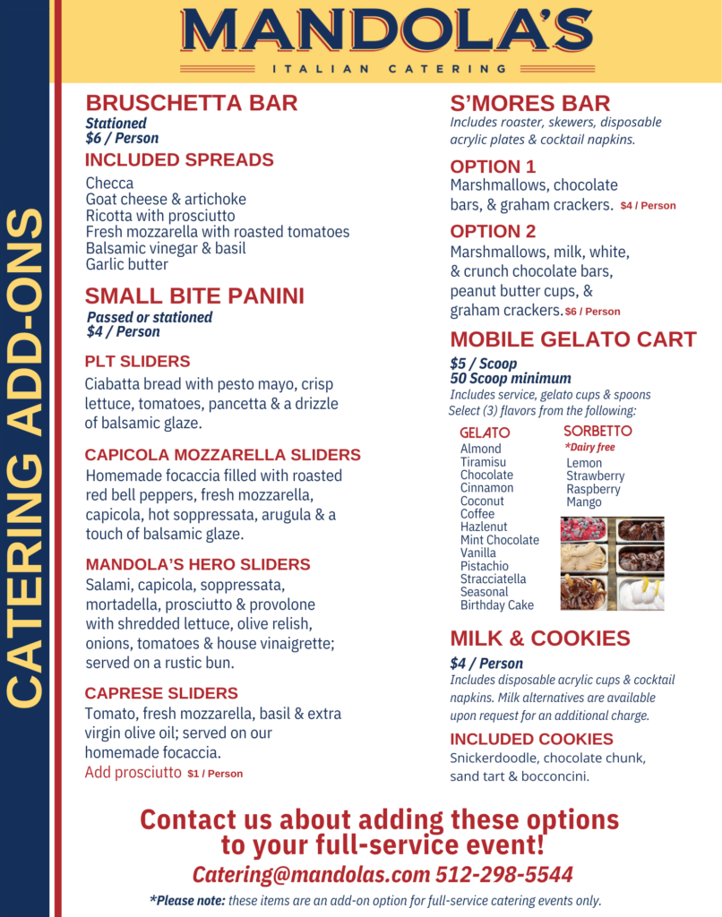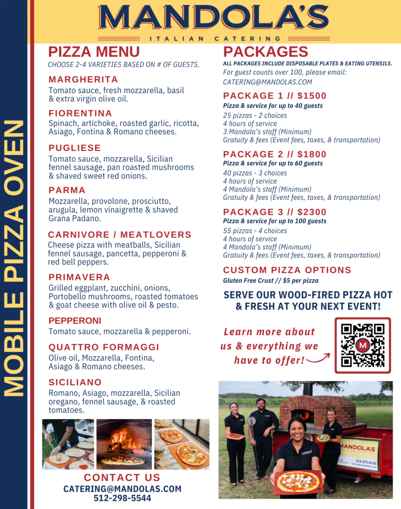 Our dedication to exceptional service ensures every detail of your event is thoughtfully managed. Enhance your celebration with unique offerings like our Mobile Pizza Oven and Gelato Bar, bringing the experience of Italy right to your guests. Trust Mandola’s Events to create unforgettable moments and exceed your expectations every step of the way.